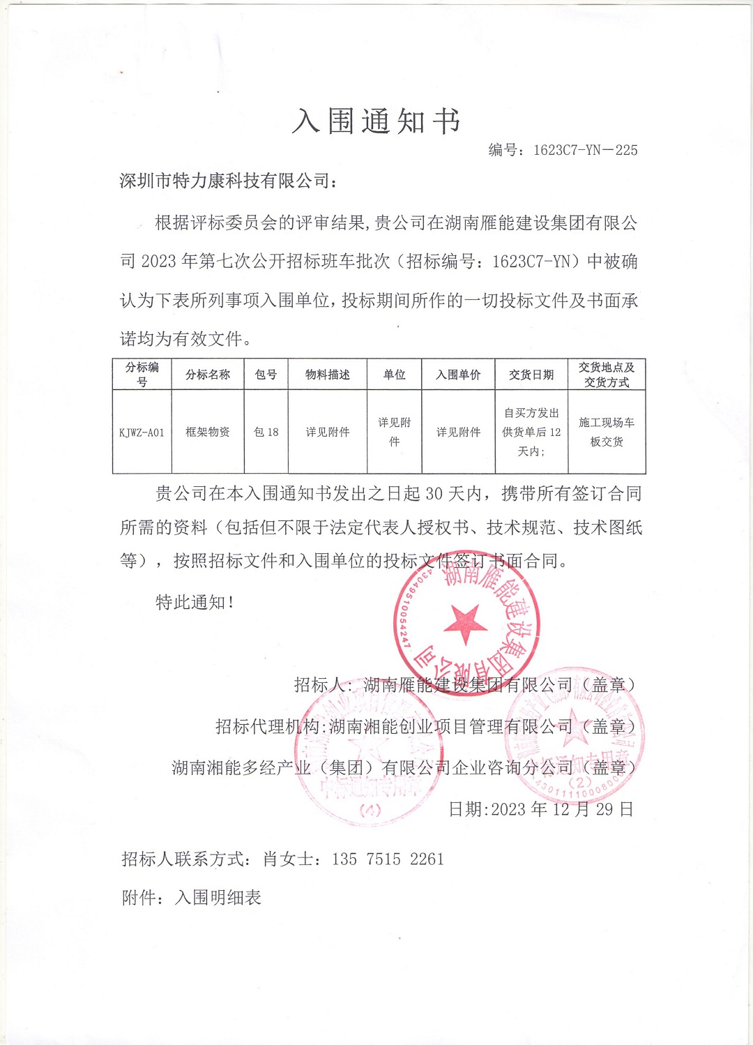 根據(jù)評標(biāo)委員會的評審結(jié)果,我司在湖南雁能建設(shè)集團(tuán)有限公司2023年第七次公開招標(biāo)班車批次(招標(biāo)編號:1623C7-YN)中表現(xiàn)出色,經(jīng)過嚴(yán)格評審,我司被確認(rèn)為本次招標(biāo)項目的入圍單位。
