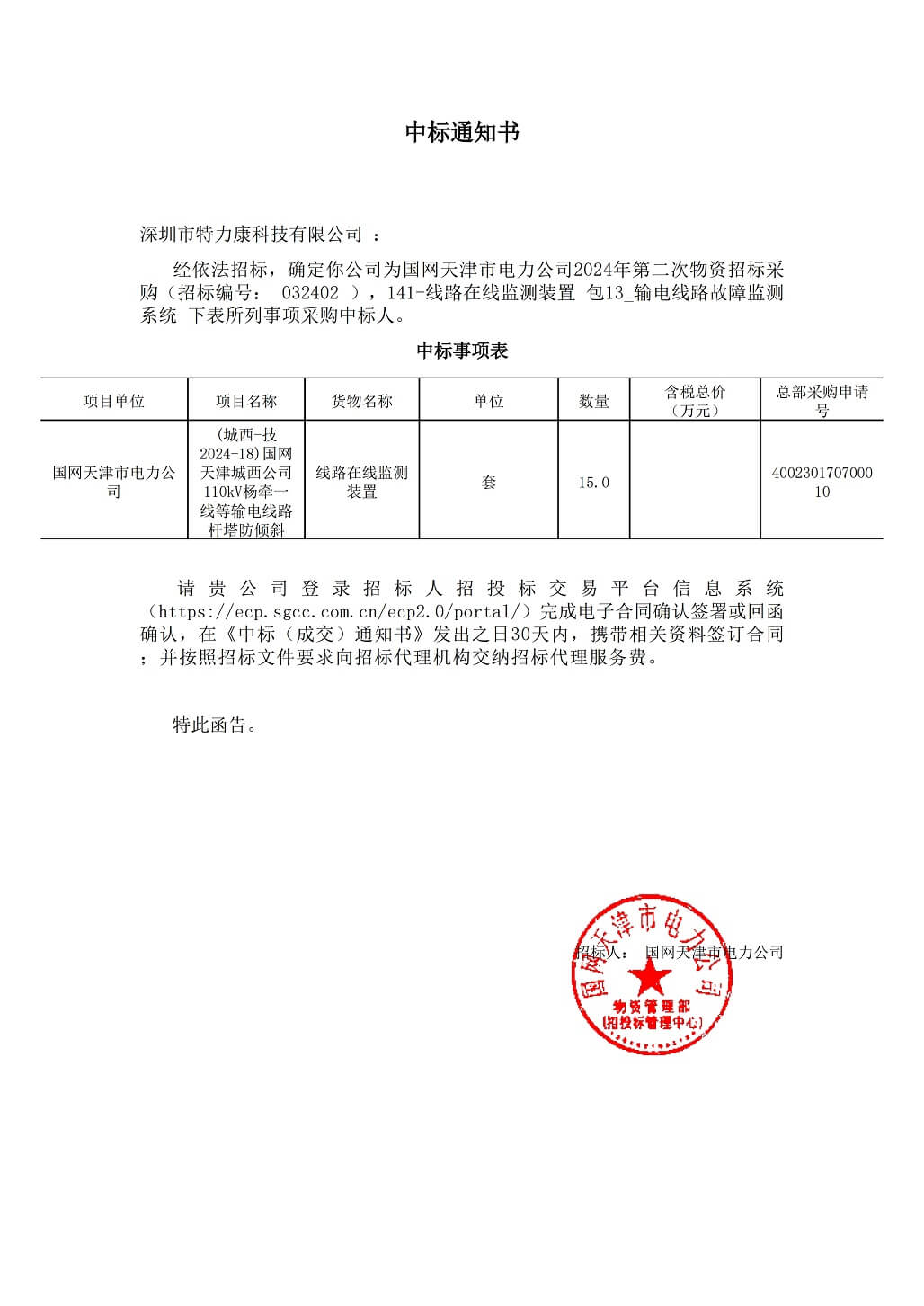 2024年4月18日——深圳市特力康科技有限公司(特力康)宣布,我司已中標(biāo)國(guó)網(wǎng)天津市電力公司2024年第二次物資招標(biāo)采購(gòu)項(xiàng)目中的141-線路在線監(jiān)測(cè)裝置包13_輸電線路故障監(jiān)測(cè)系統(tǒng)。
