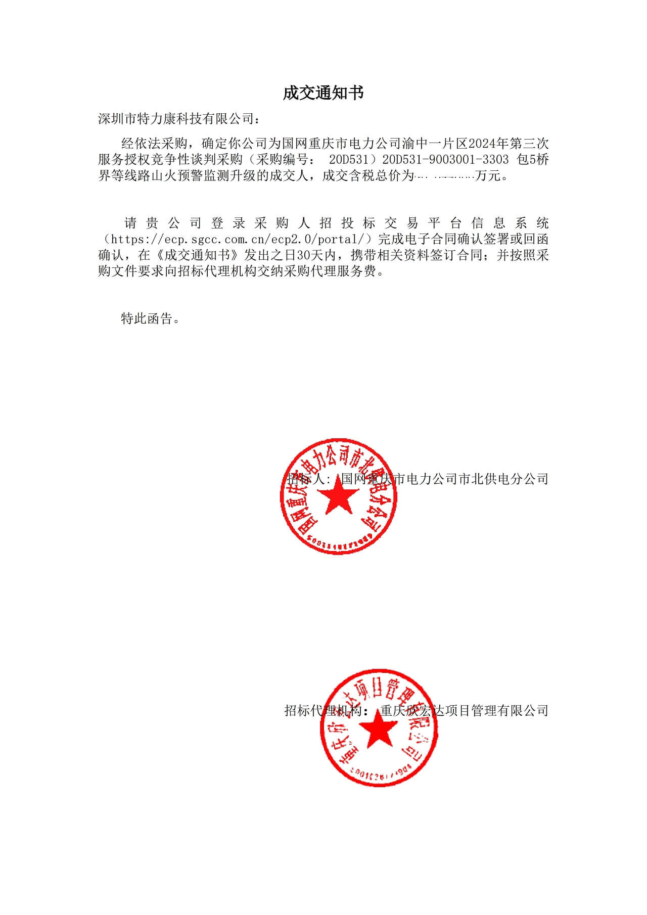 深圳,2024年4月26日——深圳市特力康科技有限公司(以下簡(jiǎn)稱“特力康”)近日收到喜訊,經(jīng)過(guò)嚴(yán)格的評(píng)審和競(jìng)爭(zhēng)性談判,我司成功中標(biāo)國(guó)網(wǎng)重慶市電力公司渝中一片區(qū)2024年第三次服務(wù)授權(quán)競(jìng)爭(zhēng)性談判采購(gòu)項(xiàng)目(采購(gòu)編號(hào):20D531)中的20D531-9003001-3303包5橋界等線路山火預(yù)警監(jiān)測(cè)升級(jí)服務(wù)。