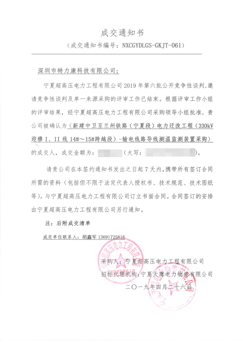 寧夏超高壓局2019年第六批公開競爭性談判電力遷改項(xiàng)目評審工作已結(jié)束,經(jīng)評審委員會評審,經(jīng)寧夏超高壓局招投標(biāo)領(lǐng)導(dǎo)小組批準(zhǔn),我司被確定為此項(xiàng)目簽約單位現(xiàn)將公告公示。