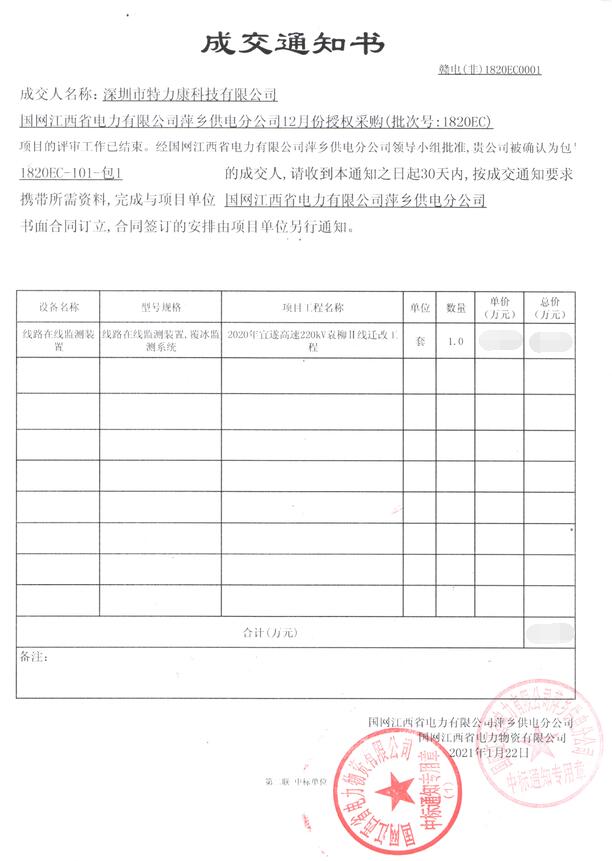 國網(wǎng)江西省電力有限公司萍鄉(xiāng)供電分公司12月份授權(quán)采購(批次號: 1820EC)項目的評審工作已結(jié)束。經(jīng)國網(wǎng)江西省電力有限公司萍鄉(xiāng)供電分公間領(lǐng)導(dǎo)小組批準(zhǔn),我司(深圳市特力康科技有限公司)被確認為包1820EC- 101-包1(線路在線監(jiān)測裝置,覆冰監(jiān)測系統(tǒng))的成交人,成交通知如下: