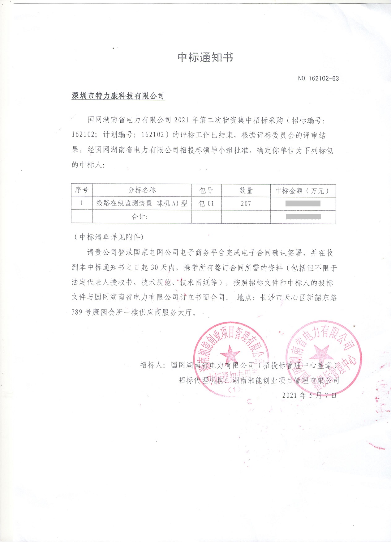 國網(wǎng)湖南省電力有限公司2021年第二次物資集中招標采購(招標編號:162102;計劃編號: 162102) 的評標工作已結(jié)束,根據(jù)評標委員會的評審結(jié)果,經(jīng)國網(wǎng)湖南省電力有限公司招投標領導小組批準,確定我司為線路在線監(jiān)測裝置-球機AI型標包的中標人,中標通知如下: