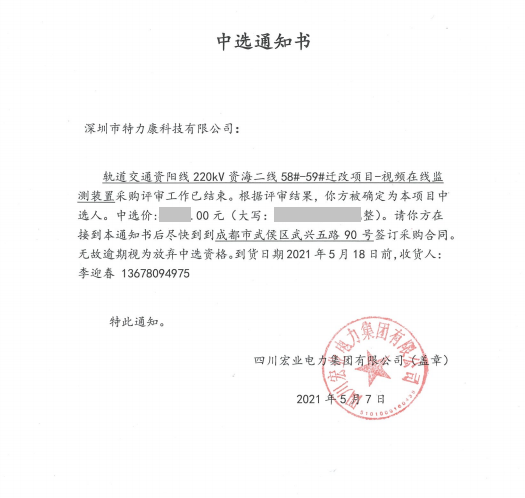 軌道交通資陽線220kV資海二線58#- 59#遷改項目一視頻在線監(jiān)測裝置采購評審工作已結(jié)束。根據(jù)評審結(jié)果,我司被確定為本項目中標人,中標通知如下: