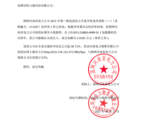 國網(wǎng)河南省電力公司2021年第一批電商化公開競爭性談判采購《- -) (果購編號: 172107) 的評審工作已結(jié)束。根據(jù)評審委員合的評審結(jié)果,經(jīng)國網(wǎng)河南省電力公司招投標(biāo)領(lǐng)導(dǎo)小組批準(zhǔn),在7210710101.9999標(biāo)1包攝像機(jī)的應(yīng)答中,責(zé)公司被確認(rèn)為成交人,中標(biāo)通知如下: