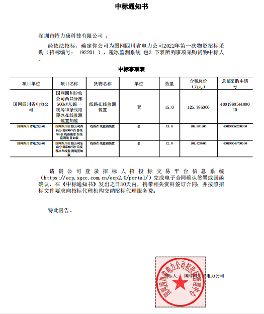 深圳市特力康科技有限公司:經(jīng)依法招標(biāo),確定你公司為國網(wǎng)四川省電力公司2022年第一次物資招標(biāo)采購(招標(biāo)編號: 192201 ),覆冰監(jiān)測系統(tǒng)包3下表所列事項采購貨物中標(biāo)人,中標(biāo)通知如下: