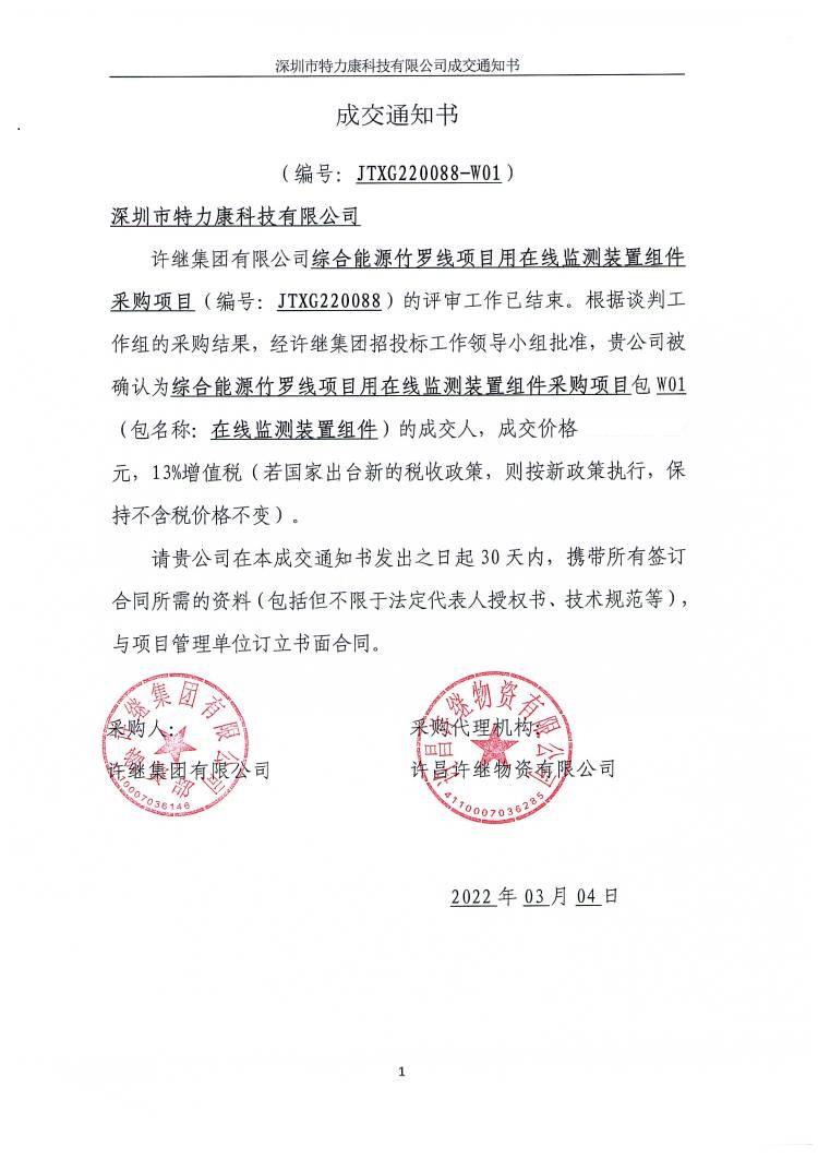 許繼集團有限公司綜合能源竹羅線項目用在線監(jiān)測裝置組件采購項且(編號: JTX6220088)的評審工作已結(jié)束。根據(jù)談判工作組的采購結(jié)果,經(jīng)許繼集團招投標工作領導小組批準,貴公司被確認為綜合能源竹羅線項且用在線監(jiān)測裝置組件采購項目包W01(包名稱:在線監(jiān)測裝置組件)的成交人,成交通知如下: