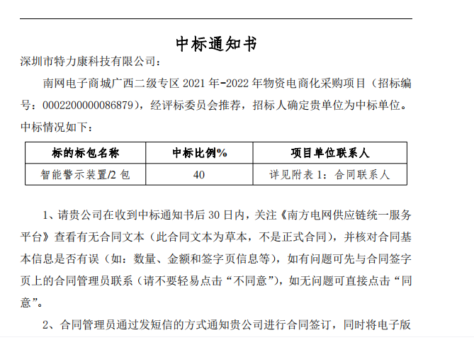 我司中標(biāo)南網(wǎng)電子商城廣西二級(jí)專區(qū)2021年-2022年物資電商化采購(gòu)項(xiàng)目(招標(biāo)編號(hào): 0020000086879) - 智能警示裝置,經(jīng)評(píng)標(biāo)委員會(huì)推薦,招標(biāo)人確定我單位為中標(biāo)單位。中標(biāo)情況如下: