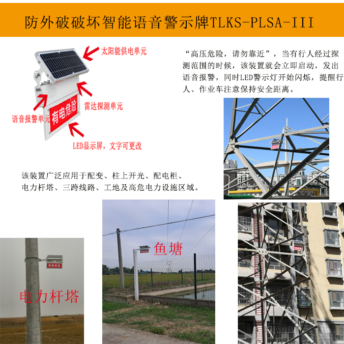 TLKS-PLSA-III線路防外力破壞智能警示牌廣泛適用于配變、柱上開關(guān)、配電柜、電力桿塔、三跨線路、工地及高危電力設(shè)施區(qū)域,為這些關(guān)鍵區(qū)域提供強有力的安全保障。