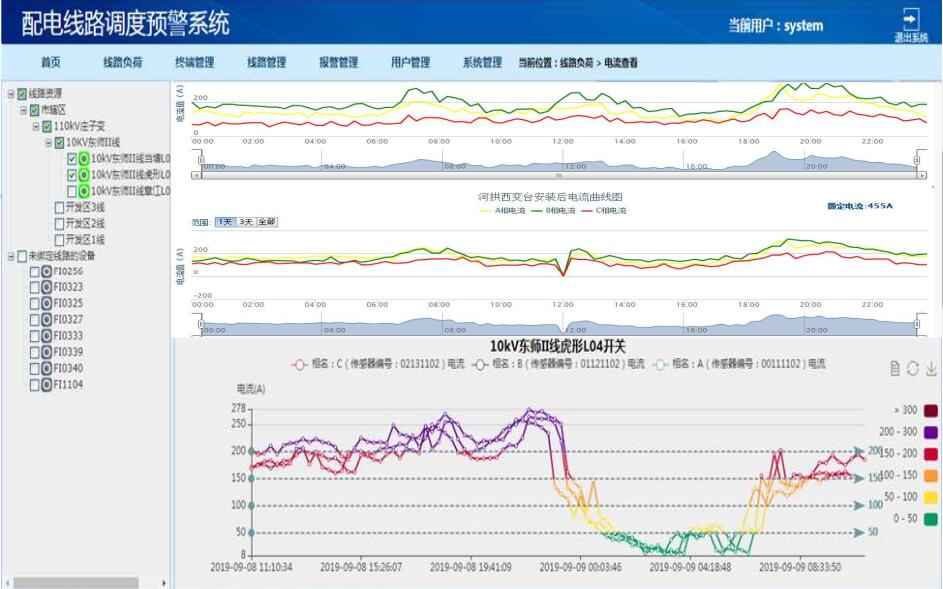 導(dǎo)線負荷溫升監(jiān)測系統(tǒng)綜合運用了太陽能取電、無線通信及信息網(wǎng)絡(luò)等現(xiàn)代科學(xué)新技術(shù)。能實時準確地在線監(jiān)測線路狀態(tài),并將所采集到的負荷及溫度等信息發(fā)送回主站中心;主站對信息進行數(shù)據(jù)統(tǒng)計、分析、拓撲計算,確定負荷溫升狀態(tài),從而引導(dǎo)工作人員定位隱患。為提高相關(guān)工作人員的效率、減輕勞動強度提供了一種強有力的手段;同時,溫度信息會通過短消息發(fā)送到供電局生產(chǎn)管理部門、線路專工、線路維護負責(zé)人等設(shè)定的相關(guān)人員的手機上,能有效提高線路故障檢測的自動化水平,及時為線路安全性能監(jiān)測提供科學(xué)有效的依據(jù),為電力的輸送及減人增效提供條件。