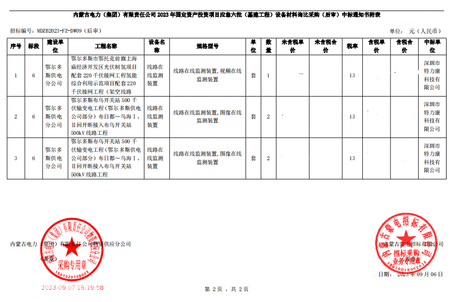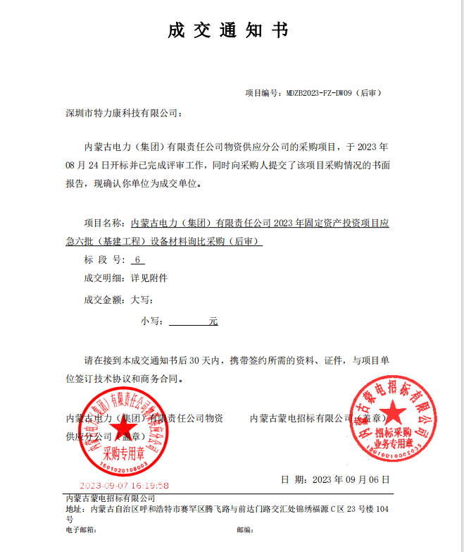 內(nèi)蒙古電力(集團(tuán))有限責(zé)任公司物資供應(yīng)分公司的采購項目,于2023年08月24日開標(biāo)并已完成評審工作,同時向采購人提交了該項目采購情況的書面報告,現(xiàn)確認(rèn)我單位為成交單位,中標(biāo)通知如下: