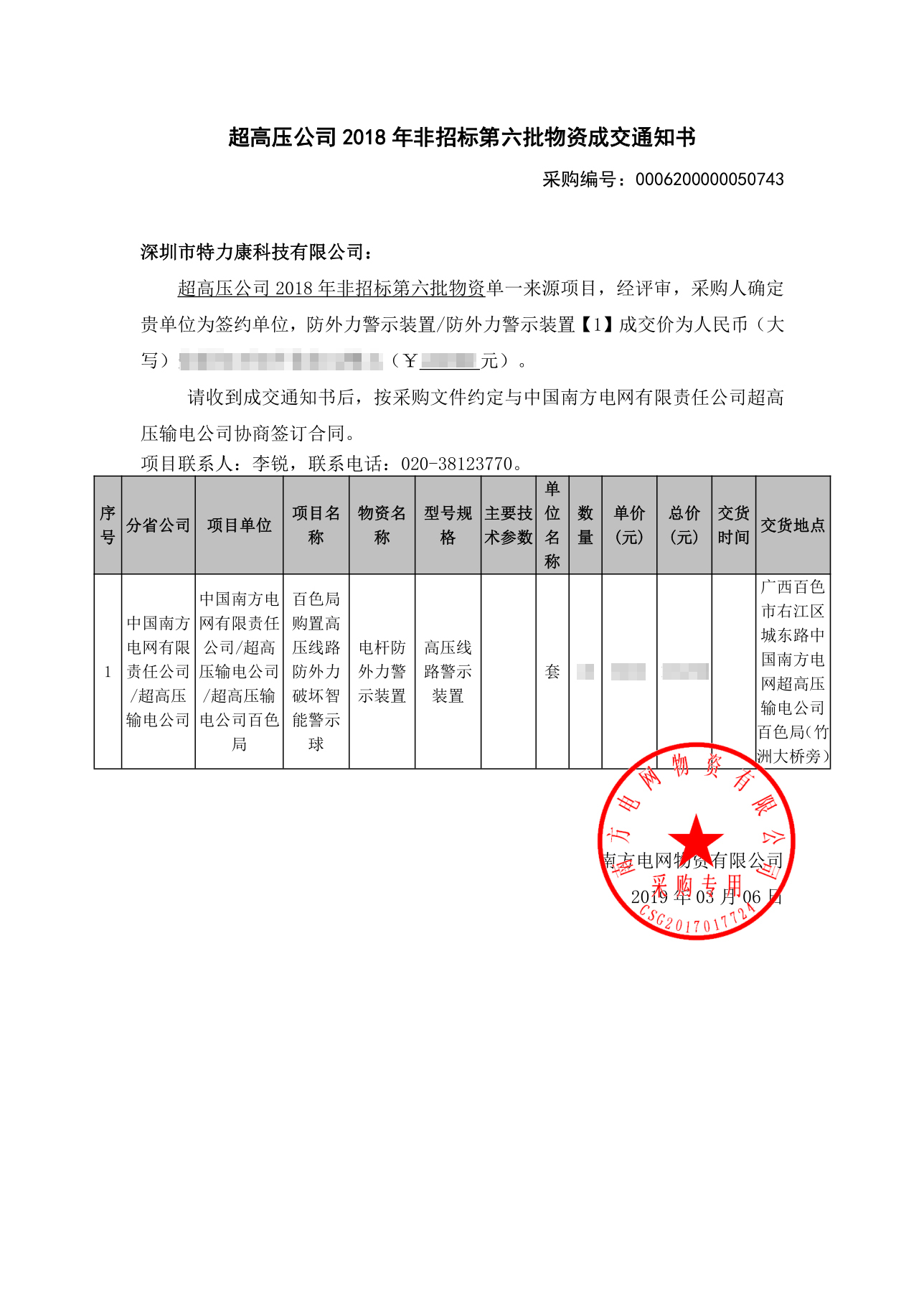 南方電網(wǎng)廣西百色超高壓局2018非招標(biāo)第六批物資評審工作已結(jié)束,經(jīng)評審委員會推薦,經(jīng)南網(wǎng)廣西供電公司電力公司招投標(biāo)領(lǐng)導(dǎo)小組批準(zhǔn),確定我司為廣西百色超高壓局2018非招標(biāo)第六批物資防外力警示裝置中標(biāo)單位。