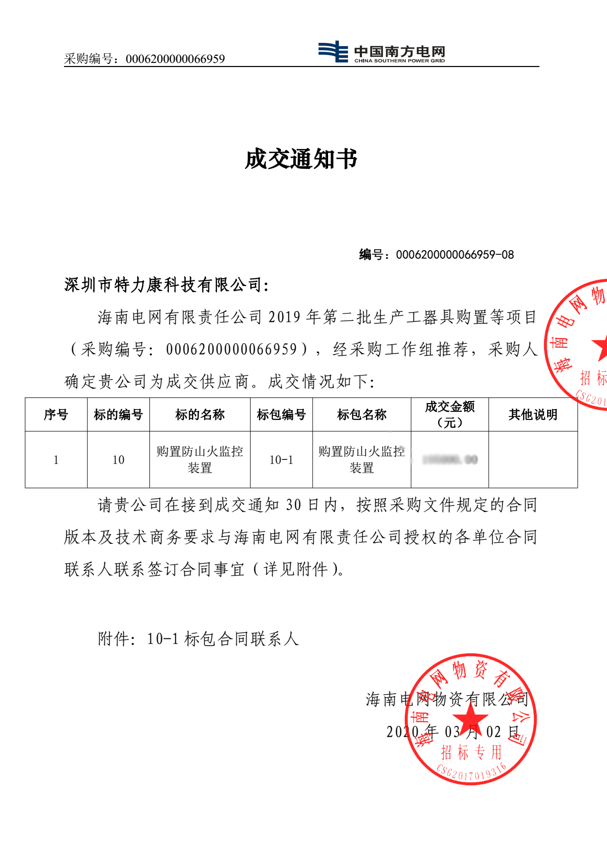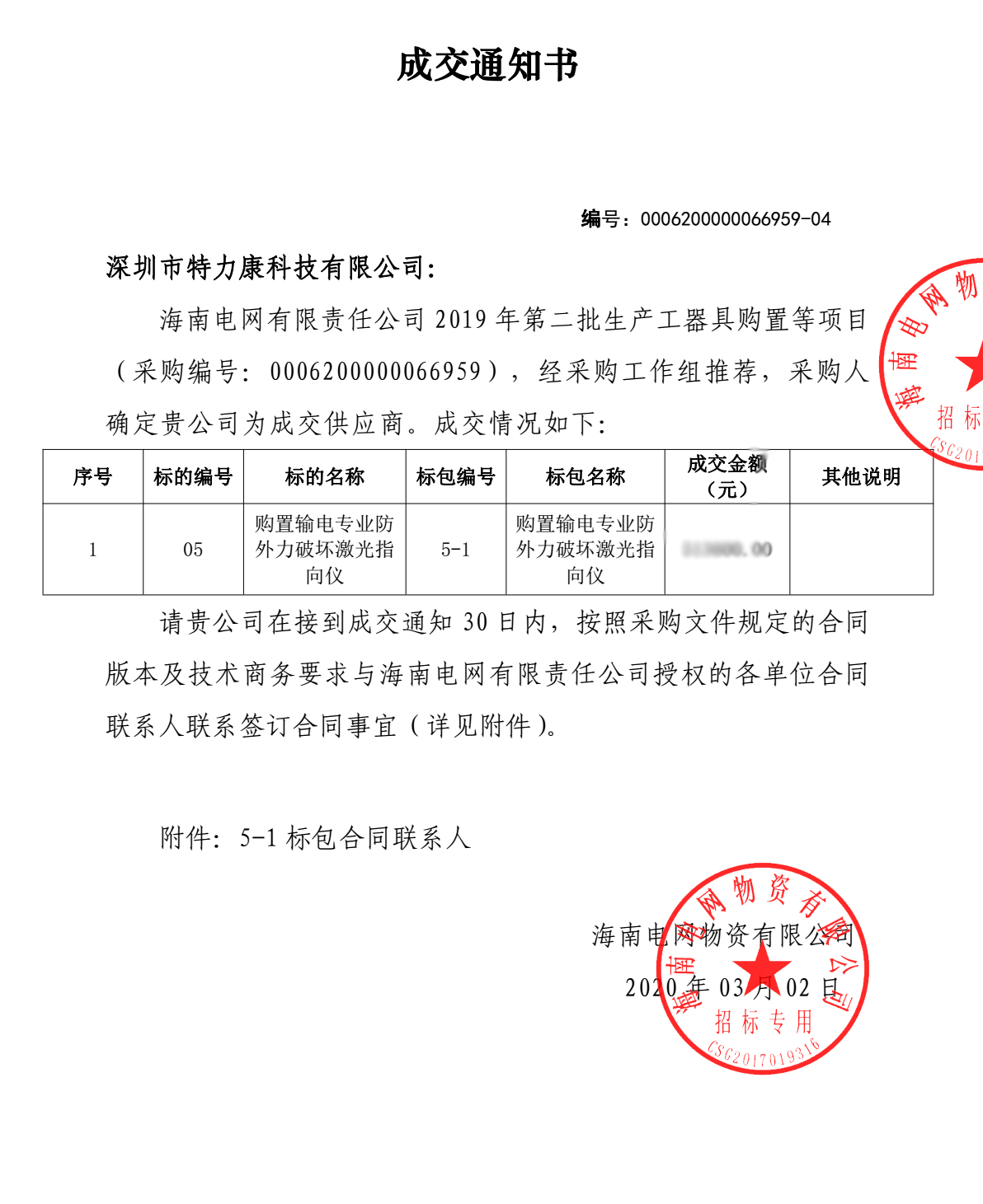 海南電網(wǎng)有限責任公司2019年第二批生產(chǎn)工器具購等項目(采購編號; 0000660509 )采購工作已完成。經(jīng)采購工作組推薦,采購人確定我司(深圳市特力康科技有限公司)成為本此標包5-1購置輸電專業(yè)防外力破壞激光指向儀及標包10-1購置防山火監(jiān)控裝置的成交供應商,附成交通知書如下: