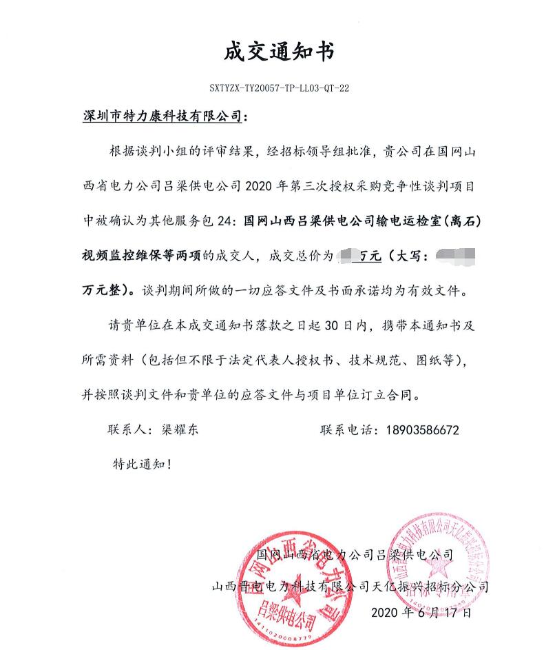根據(jù)談判小組的評審結(jié)果,經(jīng)招標(biāo)領(lǐng)導(dǎo)組批準(zhǔn),我司(深圳市特力康科技有限公司)在國網(wǎng)山西省電力公司呂梁供電公司2020年第三次授權(quán)采購競爭性談判項目中被確認(rèn)為其他服務(wù)包24:國網(wǎng)山西呂梁供電公司輸電運(yùn)檢室(離石)視頻監(jiān)控維保等兩項的成交人,現(xiàn)中標(biāo)通知以下: