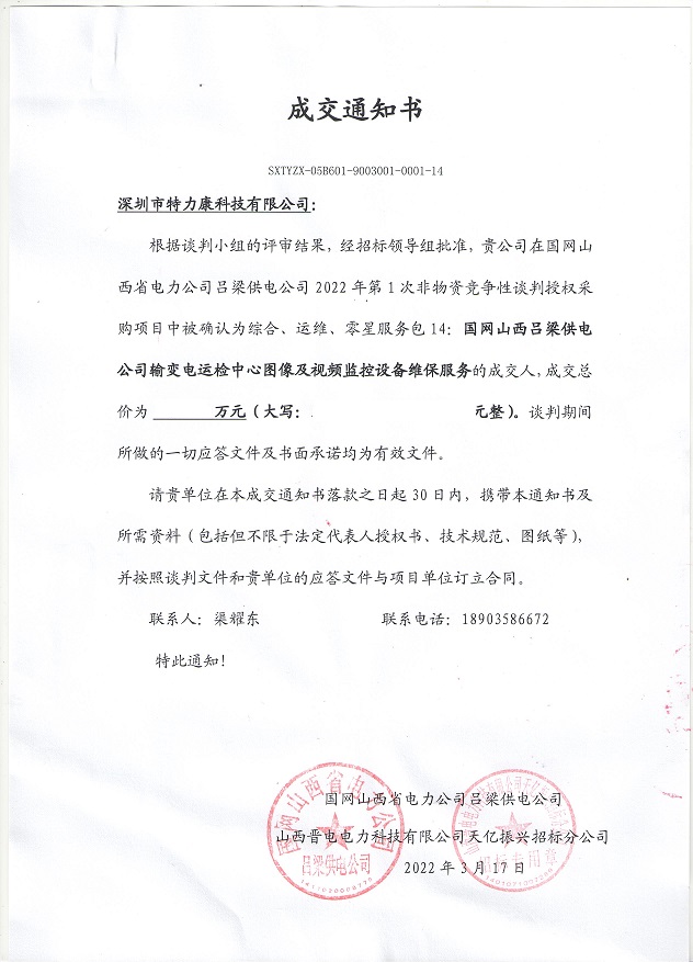 根據(jù)談判小組的評(píng)審結(jié)果,經(jīng)招標(biāo)領(lǐng)導(dǎo)組批準(zhǔn),貴公司在國(guó)網(wǎng)山西省電力公司呂梁供電公司2022年第1次非物資競(jìng)爭(zhēng)性談判授權(quán)采購(gòu)項(xiàng)目中被確認(rèn)為綜合、運(yùn)維,零星服務(wù)包14:國(guó)網(wǎng)山西呂梁供電公司榆變電運(yùn)檢中心圖像及視頻監(jiān)控設(shè)備維保服務(wù)的成交人,中標(biāo)公告如下:
